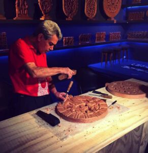 Para dar vida a suas peças ele realiza um processo que aprendeu com o pai. Primeiro desenha no bloco de madeira o esboço de sua obra. Com o auxílio de um canivete e um formão, Mario esculpe em blocos de madeira sua arte. O artistas traz grande precisão simétrica e detalhes ricos, o que transmite uma sensação rítmica pela sucessão de figuras representadas.