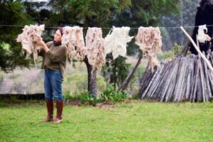 A partir da criação de ovinos na propriedade da família, a produção do Fio Farroupilha envolve um processo sustentável, desde a obtenção da lã até o tingimento natural do novelo. O processo criativo de Andrea é influenciado por diversas referências visuais, como as tecelagens dos povos nativos mapuche, habitantes do pampa e da Patagônia.